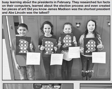 Miss Johnson's second-grade class (above) listened to stories about George Washington and Abraham Lincoln on Presidents Day. The class read a poem about the presidents and did an art project to go with it. Mrs. Walden’s second graders (some of whom are shown below) have also been busy learning about the presidents in February. They researched fun facts on their computers, learned about the election process and even created fun pieces of art! Did you know James Madison was the shortest president and Abe Lincoln was the tallest?
