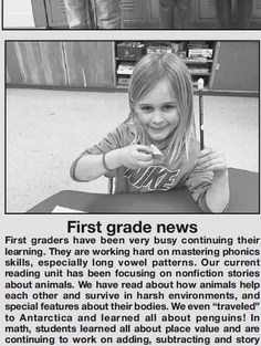 First graders have been very busy continuing their learning. They are working hard on mastering phonics skills, especially long vowel patterns. Our current reading unit has been focusing on nonfiction stories about animals. We have read about how animals help each other and survive in harsh environments, and special features about their bodies. We even “traveled” to Antarctica and learned all about penguins! In math, students learned all about place value and are continuing to work on adding, subtracting and story problems. In January, they got to enjoy their Christmas activity day at the Loyal Rec. Center. They participated in Christmas games, a craft, bingo and even decorated Christmas cookies! First graders also got to have a tasting party after reading about where different foods come from. They tasted some different cheeses and jellies (photo above). We are looking forward to more learning and fun as spring approaches!