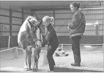 For example, students might train a horse to step over a platform. They use shaping, which is the act of reinforcing small steps that progressively lead towards an end goal. A small step could be something as simple as the horse shifting its weight or turning its head that indicates it’s moving toward the desired behavior. Those little steps are rewarded and gradually the horse is encouraged to step further out of its comfort zone.
