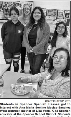 Students in Spencer Spanish classes got to interact with Ana Maria Semino Macias-Sanchez Wasserburger, mother of Lisa Vann, K-12 Spanish educator at the Spencer School District. Students enjoyed making quesadillas and talking with Vann’s mother about life in Seville, Spain, and her journey to become a U.S. citizen years ago.