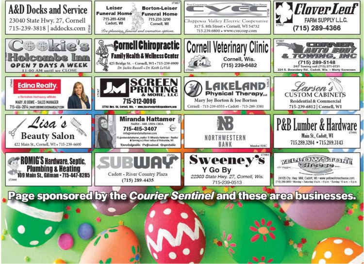 173857 173749 Leiser Funeral Home 715-289-4298 Cadott, WI A&D Docks and Service 23040 State Hwy. 27, Cornell 715-239-3818 | addocks.com Borton-Leiser Funeral Home 715-239-3290 Cornell, WI 173847 173543 Pre-planning, funeral and cremation options. 317 S. 8th Street • Cornell, WI 54732 715.239.6800 • www.cvecoop.com (715) 289-4366 173907 Cornell Chiropractic Cornell Veterinary Clinic 173899 Family Health & Wellness Center 17- 3826 425 Bridge St. ~ Cornell, WI • 715-239-0909 Cornell, Wis. (715) 239-6482 (715) 289-5148 Dr. Jackie Russell • Dr. Keith LeVick 173541 24/7 Towing call (715) 271-0731 224 S. Boundary Rd., Cadott, Wis. ~ Marty Sorensen 173753 173860 175075 175367 MARY JO BOWE - SALES MANAGER 715-312-0096 Mary Joy Borton & Joe Borton Residential & Commercial 715-239-6812 | Cornell, WI 715-456-2014 | MARYJOBOWE@EDINAREALTY.COM 27703 Hwy. 64, Cornell, Wis. • www.jmscreenprintingandmore.com Cornell - 715-239-0555 • Cadott - 715-289-3581 715-312-0096 jmscreenprintingandmore.com 27703 Hwy. 64., Cornell, Wis. SCREEN PRINTING EMBROIDERY • VINYL DECALS PROMOTIONAL ITEMS LARGE PRINT MEDIA • DTFs Miranda Hattamer 179829 Lisa’s Realtor – ABR. CREN. CBDA. 173538 P& B Lumber & Hardware 1- 73751 715-415-3407 169812 info@mirandahattamer.com 173901 Beauty Salon @mirandahattamer_realtor Miranda Hattamer - Realtor Serving a 2-Hour radius of Holcombe, WI Main St., Cadott, WI 715.289.3204 • 715.289.3143 422 Main St., Cornell, WI • 715-239-6600 Knowledgeable. Professional. Respectable. Member FDIC 173755 173903 Sweeney’s 17- 3824 Y Go By Cadott - River Country Plaza 22303 State Hwy. 27, Cornell, Wis. 173909 (715) 289-4435 24105 Cty. Hwy. MM, Cadott, WI • www.yellowstonecheese.com 715-239-0513 (715) 289-3800 • Monday – Saturday: 9 a.m. – 6 p.m. • Sunday: 10 a.m. – 5 p.m. Page sponsored by the Courier Sentinel and these area businesses. 173857 173749 Leiser Funeral Home 715-289-4298 Cadott, WI A&D Docks and Service 23040 State Hwy. 27, Cornell 715-239-3818 | addocks.com Borton-Leiser Funeral Home 715-239-3290 Cornell, WI 173847 173543 Pre-planning, funeral and cremation options. 317 S. 8th Street • Cornell, WI 54732 715.239.6800 • www.cvecoop.com (715) 289-4366 173907 Cornell Chiropractic Cornell Veterinary Clinic 173899 Family Health & Wellness Center 17- 3826 425 Bridge St. ~ Cornell, WI • 715-239-0909 Cornell, Wis. (715) 239-6482 (715) 289-5148 Dr. Jackie Russell • Dr. Keith LeVick 173541 24/7 Towing call (715) 271-0731 224 S. Boundary Rd., Cadott, Wis. ~ Marty Sorensen 173753 173860 175075 175367 MARY JO BOWE - SALES MANAGER 715-312-0096 Mary Joy Borton & Joe Borton Residential & Commercial 715-239-6812 | Cornell, WI 715-456-2014 | MARYJOBOWE@EDINAREALTY.COM 27703 Hwy. 64, Cornell, Wis. • www.jmscreenprintingandmore.com Cornell - 715-239-0555 • Cadott - 715-289-3581 715-312-0096 jmscreenprintingandmore.com 27703 Hwy. 64., Cornell, Wis. SCREEN PRINTING EMBROIDERY • VINYL DECALS PROMOTIONAL ITEMS LARGE PRINT MEDIA • DTFs Miranda Hattamer 179829 Lisa’s Realtor – ABR. CREN. CBDA. 173538 P& B Lumber & Hardware 1- 73751 715-415-3407 169812 info@mirandahattamer.com 173901 Beauty Salon @mirandahattamer_realtor Miranda Hattamer - Realtor Serving a 2-Hour radius of Holcombe, WI Main St., Cadott, WI 715.289.3204 • 715.289.3143 422 Main St., Cornell, WI • 715-239-6600 Knowledgeable. Professional. Respectable. Member FDIC 173755 173903 Sweeney’s 17- 3824 Y Go By Cadott - River Country Plaza 22303 State Hwy. 27, Cornell, Wis. 173909 (715) 289-4435 24105 Cty. Hwy. MM, Cadott, WI • www.yellowstonecheese.com 715-239-0513 (715) 289-3800 • Monday – Saturday: 9 a.m. – 6 p.m. • Sunday: 10 a.m. – 5 p.m. Page sponsored by the Courier Sentinel and these area businesses.