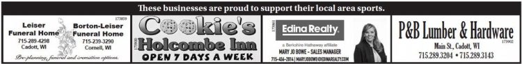 These businesses are proud to support their local area sports. 173859 173861 P&B Lumber & Hardware Leiser Funeral Home 715-289-4298 Cadott, WI Borton-Leiser Funeral Home 715-239-3290 Cornell, WI 173900 173902 MARY JO BOWE - SALES MANAGER Main St., Cadott, WI 715.289.3204 • 715.289.3143 Pre-planning, funeral and cremation options. 715-456-2014 | MARYJOBOWE@EDINAREALTY.COM These businesses are proud to support their local area sports. 173859 173861 P&B Lumber & Hardware Leiser Funeral Home 715-289-4298 Cadott, WI Borton-Leiser Funeral Home 715-239-3290 Cornell, WI 173900 173902 MARY JO BOWE - SALES MANAGER Main St., Cadott, WI 715.289.3204 • 715.289.3143 Pre-planning, funeral and cremation options. 715-456-2014 | MARYJOBOWE@EDINAREALTY.COM