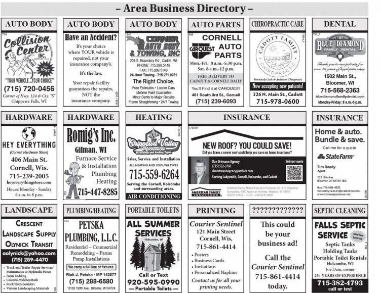 – Area Business Directory – AUTO BODY AUTO BODY AUTO BODY AUTO PARTS CHIROPRACTIC CARE DENTAL 754 547 548 757_2 79214_3 CORNELL AUTO PARTS Have an Accident? It’s your choice where YOUR vehicle is repaired, not your insurance company’s. 224 S. Boundary Rd., Cadott, WI PHONE: 715.289.5148 FAX: 715.289.5149 24-Hour Towing - 715.271.0731 Mon.-Fri. 8 a.m.-5:30 p.m. Sat. 8 a.m.-12 p.m. Thank you to our patients for over 40 years of loyal patronage. It’s the law. FREE DELIVERY TO CADOTT & CORNELL DAILY The Right Choice. Previously Cook & Anderson Chiropractic 1502 Main St., Bloomer, WI Now accepting new patients! (715) 720-0456 You’ll Find it at CARQUEST Your repair facility guarantees the repairs, NOT the insurance company. 715-568-2363 Corner of Hwy. 124 & Cty. “S” Free Estimates • Loaner Cars Lifetime Paint Guarantee Minor Dents to Major Repairs Frame Straightening • 24/7 Towing 401 South 3rd St., Cornell 326 N. Main St., Cado_ 1428 • 1429 bluediamondfamilydental.com Chippewa Falls, WI (715) 239-6093 715-978-0600 Monday-Friday: 8 a.m.-5 p.m. HARDWARE HARDWARE HEATING INSURANCE INSURANCE TU(___V__XY-UZ [Y'*\___V__]X^_Z 171109 59607_4 88037_5 TU(___V__XY-UZ [Y'*\___V__]X^_Z Romig’s Inc. TU(___V__XY-UZ [Y'*\___V__]X^_Z _..______! ____`_ ____ NEW ROOF? YOU COULD SAVE! Gilman, WI _..______! ____`_ ____ _..______! ____`_ ____ (Cornell Hardware Store) Did you know a newer roof could help you save on home insurance? Sales, Service and Installation Dan Ortmann Agency Get your quote ALL HEATING AND COOLING TYPES __& '()_)___ Furnace Service & Installation Plumbing Heating (715) 532-3160 danortmannagency@amfam.com __& '()_)___ 715-559-6264 _____'_ 406 Main St. Cornell, Wis. 715-239-2005 heyeverythingstore.com Hours: Monday - Sunday 6 a.m. to 8 p.m. Serving Ladysmith, Cornell, Holcombe, and Cadott __& '()_)___ _____'_ __AAL___A______ ___. __ __________L__A_ _ _________A_______W_ ______ ___ __ _ ____! __# _ __$$$____ ___ . __ ____ ________ Serving the Cornell, Holcombe and surrounding areas. __AAL___A______ ___. __ __________L__A_ _ _________A_______W_ ______ ___ __ _ ____! __# _ __$$$____ ___ . __ ____ ________ American Family Mutual Insurance Company, S.I. & its Operating Companies, 6000 American Parkway, Madison, WI 53783 ©2025 23478 – 04/25 – 25650343-MOD _____'_ __AAL___A______ ___. __ __________L__A_ _ _________A_______W_ ______ ___ __ _ ____! __# _ __$$$____ ___ . __ ____ ________ 555 715-447-8285 AIR CONDITIONING 131790 LANDSCAPE PLUMBING/HEATING PORTABLE TOILETS PRINTING ,./01/201034__/56__/78953__8:__60;<8953;__/56__;/.05=;__./>4__24__;3/3?@ SEPTIC CLEANING B3/3?__C/>7__D939/1__,93878201?__E5;9>/5<?__F87G/54H__B3/3?__C/>7__E56?75034__F87G/54H__B3/3?__C/>7__C0>?__/56__F/;9/134__F87G/ B3/3?__C/>7__I?5?>/1__E5;9>/5<?__F87G/54H__J188705=385H__EK 763 B3/3?__C/>7__F89534__D939/1__E5;9>/5<?__F87G/54__8:__M?N/;H__B3/3?__C/>7__K1846;H__O0<P/>6;85H__MQ B3/3?__C/>7__C18>06/__E5;9>/5<?__F87G/54H__R053?>__S/.?5H__CK__ All Summer Services PETSKA PLUMBING, L.L.C. Courier Sentinel 121 Main Street Cornell, Wis, CRESCENT LANDSCAPE SUPPLY OLYNICK T RANSIT Under New Ownership Holcombe, WI Falls Septic Service Septic Tanks Holding Tanks Portable Toilet Rentals 561_2 ????????????? _is could be your business ad! Call the Courier Sentinel 715-861-4414 today. aolynick@yahoo.com Residential – Commercial Remodeling – Farms Pump Installations (715) 289-4470 169806 715-861-4414 • Posters • Business Cards • Invitations • Personalized Napkins Holcombe, WI We carry a full line of fixtures. Joe Dain, owner Rick J. Petska • MP 143877 Call or Text 25+ YEARS OF EXPERIENCE • Truck and Trailer Repair Services/ Maintenance & Hydraulic Hoses • Farm Bedding • Colored Mulches/Bark • Rock/Slate/Boulders • Various Landscaping Materials (715) 288-6580 920-595-0990 Contact us for all your printing needs. 715-382-4793 558 16163 190th Ave., Bloomer, WI 54724 — Portable Toilets — call or text – Area Business Directory – AUTO BODY AUTO BODY AUTO BODY AUTO PARTS CHIROPRACTIC CARE DENTAL 754 547 548 757_2 79214_3 CORNELL AUTO PARTS Have an Accident? It’s your choice where YOUR vehicle is repaired, not your insurance company’s. 224 S. Boundary Rd., Cadott, WI PHONE: 715.289.5148 FAX: 715.289.5149 24-Hour Towing - 715.271.0731 Mon.-Fri. 8 a.m.-5:30 p.m. Sat. 8 a.m.-12 p.m. Thank you to our patients for over 40 years of loyal patronage. It’s the law. FREE DELIVERY TO CADOTT & CORNELL DAILY The Right Choice. Previously Cook & Anderson Chiropractic 1502 Main St., Bloomer, WI Now accepting new patients! (715) 720-0456 You’ll Find it at CARQUEST Your repair facility guarantees the repairs, NOT the insurance company. 715-568-2363 Corner of Hwy. 124 & Cty. “S” Free Estimates • Loaner Cars Lifetime Paint Guarantee Minor Dents to Major Repairs Frame Straightening • 24/7 Towing 401 South 3rd St., Cornell 326 N. Main St., Cado_ 1428 • 1429 bluediamondfamilydental.com Chippewa Falls, WI (715) 239-6093 715-978-0600 Monday-Friday: 8 a.m.-5 p.m. HARDWARE HARDWARE HEATING INSURANCE INSURANCE TU(___V__XY-UZ [Y'*\___V__]X^_Z 171109 59607_4 88037_5 TU(___V__XY-UZ [Y'*\___V__]X^_Z Romig’s Inc. TU(___V__XY-UZ [Y'*\___V__]X^_Z _..______! ____`_ ____ NEW ROOF? YOU COULD SAVE! Gilman, WI _..______! ____`_ ____ _..______! ____`_ ____ (Cornell Hardware Store) Did you know a newer roof could help you save on home insurance? Sales, Service and Installation Dan Ortmann Agency Get your quote ALL HEATING AND COOLING TYPES __& '()_)___ Furnace Service & Installation Plumbing Heating (715) 532-3160 danortmannagency@amfam.com __& '()_)___ 715-559-6264 _____'_ 406 Main St. Cornell, Wis. 715-239-2005 heyeverythingstore.com Hours: Monday - Sunday 6 a.m. to 8 p.m. Serving Ladysmith, Cornell, Holcombe, and Cadott __& '()_)___ _____'_ __AAL___A______ ___. __ __________L__A_ _ _________A_______W_ ______ ___ __ _ ____! __# _ __$$$____ ___ . __ ____ ________ Serving the Cornell, Holcombe and surrounding areas.