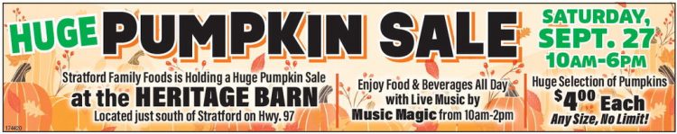 SATURDAY, PUMPKIN SALE HUGE SEPT. 27 10AM-6 PM Stratford Family Foods is Holding a Huge Pumpkin Sale Huge Selection of Pumpkins at the HERITAGE BARN $ Enjoy Food & Beverages All Day with Live Music by Music Magic from 10am-2pm 400 Each Located just south of Stratford on Hwy. 97 Any Size, No Limit! 174420 SATURDAY, PUMPKIN SALE HUGE SEPT. 27 10AM-6 PM Stratford Family Foods is Holding a Huge Pumpkin Sale Huge Selection of Pumpkins at the HERITAGE BARN $ Enjoy Food & Beverages All Day with Live Music by Music Magic from 10am-2pm 400 Each Located just south of Stratford on Hwy. 97 Any Size, No Limit! 174420