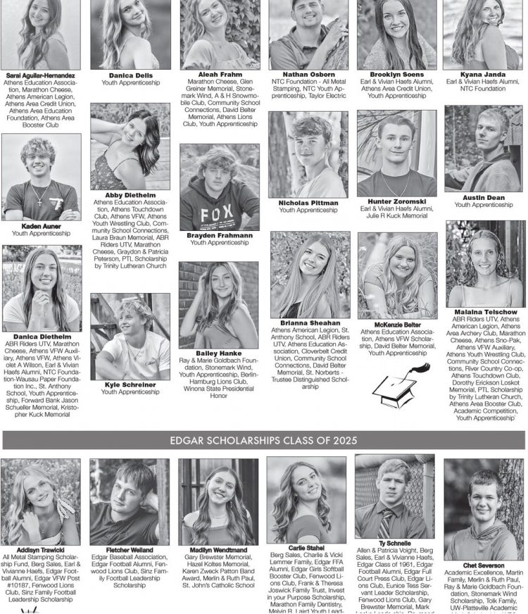Youth Apprenticeship Nathan Osborn NTC Foundation - All Metal Stamping, NTC Youth Apprenticeship, Taylor Electric Brooklyn Soens Earl & Vivian Haefs Alumni, Athens Area Credit Union, Youth Apprenticeship Earl & Vivian Haefs Alumni, NTC Foundation Sarai Aguilar-Hernandez Athens Education Association, Marathon Cheese, Athens American Legion, Athens Area Credit Union, Athens Area Education Foundation, Athens Area Booster Club Marathon Cheese, Glen Greiner Memorial, Stonemark Wind, A & H Snowmobile Club, Community School Connections, David Belter Memorial, Athens Lions Club, Youth Apprenticeship Youth Apprenticeship Youth Apprenticeship Hunter Zoromski Earl & Vivian Haefs Alumni, Julie R Kuck Memorial Kaden Auner Youth Apprenticeship Athens Education Association, Athens Touchdown Club, Athens VFW, Athens Youth Wrestling Club, Community School Connections, Laura Braun Memorial, ABR Riders UTV, Marathon Cheese, Graydon & Patricia Peterson, PTL Scholarship by Trinity Lutheran Church Brayden Frahmann Youth Apprenticeship McKenzie Belter Athens Education Association, Athens VFW Scholarship, David Belter Memorial, Youth Apprenticeship Danica Diethelm ABR Riders UTV, Marathon Cheese, Athens VFW Auxiliary, Athens VFW, Athens Violet A Wilson, Earl & Vivian Haefs Alumni, NTC Foundation- Bailey Hanke Brianna Sheahan Athens American Legion, St. Anthony School, ABR Riders UTV, Athens Education Association, Cloverbelt Credit Union, Community School Connections, David Belter Memorial, St. Norberts Trustee Distinguished Scholarship Malaina Telschow ABR Riders UTV, Athens American Legion, Athens Area Archery Club, Marathon Cheese, Athens Sno-Pak, Athens VFW Auxiliary, Athens Youth Wrestling Club, Community School Connections, River Country Co-op, Athens Touchdown Club, Dorothy Erickson Loskot Memorial, PTL Scholarship by Trinity Lutheran Church, Athens Area Booster Club, Academic Competition, Youth Apprenticeship` Ray & Marie Goldbach Foundation, Stonemark Wind, Youth Apprenticeship, Berlin Hamburg Lions Club, Winona State Presidential Honor Kyle Schreiner Youth Apprenticeship Wausau Paper Foundation Inc., St. Anthony School, Youth Apprenticeship, Forward Bank Jason Schueller Memorial, Kristopher Kuck Memorial EDGAR SCHOLARSHIPS CLASS OF 2025 Ty Schnelle Addisyn Trawicki Fletcher Weiland Carlie Stahel Madilyn Wendtmand Gary Brewster Memorial, Hazel Koltes Memorial, Karen Zweck Patton Band Award, Merlin & Ruth Paul, St. John’s Catholic School Chet Severson Edgar Baseball Association, Edgar Football Alumni, Fenwood Lions Club, Sinz Family Football Leadership Scholarship All Metal Stamping Scholarship Fund, Berg Sales, Earl & Vivianne Haefs, Edgar Football Alumni, Edgar VFW Post #10187, Fenwood Lions Club, Sinz Family Football Leadership Scholarship Berg Sales, Charlie & Vicki Lemmer Family, Edgar FFA Alumni, Edgar Girls Softball Booster Club, Fenwood Lions Club, Frank & Theresa Joswick Family Trust, Invest in your Purpose Scholarship, Marathon Family Dentistry, Melvin R. Laird Youth Leadership Allen & Patricia Voight, Berg Sales, Earl & Vivianne Haefs, Edgar Class of 1961, Edgar Football Alumni, Edgar Full Court Press Club, Edgar Lions Club, Eunice Tess Servant Leader Scholarship, Fenwood Lions Club, Gary Brewster Memorial, Mark Lacke Leadership, Raymond Academic Excellence, Martin Family, Merlin & Ruth Paul, Ray & Marie Goldbach Foundation, Stonemark Wind Scholarship, Tolk Family, UW-Platteville Academic Merit Scholarship, WPS Youth Apprenticeship Nathan Osborn NTC Foundation - All Metal Stamping, NTC Youth Apprenticeship, Taylor Electric Brooklyn Soens Earl & Vivian Haefs Alumni, Athens Area Credit Union, Youth Apprenticeship Earl & Vivian Haefs Alumni, NTC Foundation Sarai Aguilar-Hernandez Athens Education Association, Marathon Cheese, Athens American Legion, Athens Area Credit Union, Athens Area Education Foundation, Athens Area Booster Club Marathon Cheese, Glen Greiner Memorial, Stonemark Wind, A & H Snowmobile Club, Community School Connections, David Belter Memorial, Athens Lions Club, Youth Apprenticeship Youth Apprenticeship Youth Apprenticeship Hunter Zoromski Earl & Vivian Haefs Alumni, Julie R Kuck Memorial Kaden Auner Youth Apprenticeship Athens Education Association, Athens Touchdown Club, Athens VFW, Athens Youth Wrestling Club, Community School Connections, Laura Braun Memorial, ABR Riders UTV, Marathon Cheese, Graydon & Patricia Peterson, PTL Scholarship by Trinity Lutheran Church Brayden Frahmann Youth Apprenticeship McKenzie Belter Athens Education Association, Athens VFW Scholarship, David Belter Memorial, Youth Apprenticeship Danica Diethelm ABR Riders UTV, Marathon Cheese, Athens VFW Auxiliary, Athens VFW, Athens Violet A Wilson, Earl & Vivian Haefs Alumni, NTC Foundation- Bailey Hanke Brianna Sheahan Athens American Legion, St. Anthony School, ABR Riders UTV, Athens Education Association, Cloverbelt Credit Union, Community School Connections, David Belter Memorial, St. Norberts Trustee Distinguished Scholarship Malaina Telschow ABR Riders UTV, Athens American Legion, Athens Area Archery Club, Marathon Cheese, Athens Sno-Pak, Athens VFW Auxiliary, Athens Youth Wrestling Club, Community School Connections, River Country Co-op, Athens Touchdown Club, Dorothy Erickson Loskot Memorial, PTL Scholarship by Trinity Lutheran Church, Athens Area Booster Club, Academic Competition, Youth Apprenticeship` Ray & Marie Goldbach Foundation, Stonemark Wind, Youth Apprenticeship, Berlin Hamburg Lions Club, Winona State Presidential Honor Kyle Schreiner Youth Apprenticeship Wausau Paper Foundation Inc., St. Anthony School, Youth Apprenticeship, Forward Bank Jason Schueller Memorial, Kristopher Kuck Memorial EDGAR SCHOLARSHIPS CLASS OF 2025 Ty Schnelle Addisyn Trawicki Fletcher Weiland Carlie Stahel Madilyn Wendtmand Gary Brewster Memorial, Hazel Koltes Memorial, Karen Zweck Patton Band Award, Merlin & Ruth Paul, St. John’s Catholic School Chet Severson Edgar Baseball Association, Edgar Football Alumn