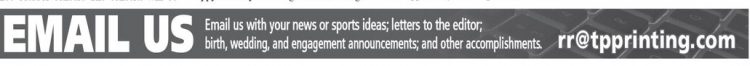 EMAIL US Email us with your news or sports ideas; letters to the editor; birth, wedding, and engagement announcements; and other accomplishments. rr@tpprinting.com EMAIL US Email us with your news or sports ideas; letters to the editor; birth, wedding, and engagement announcements; and other accomplishments. rr@tpprinting.com
