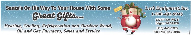 Santa’s On His Way To Your House With Some Lee’s Equipment, Inc. Great Gifts... 1-800-492-9945 232471 Co. Rd. S Edgar, WI 54426 (715) 443-3326 Fax (715) 443-2986 Heating, Cooling, Refrigeration and Outdoor Wood, Oil and Gas Furnaces, Sales and Service 143152 Santa’s On His Way To Your House With Some Lee’s Equipment, Inc. Great Gifts... 1-800-492-9945 232471 Co. Rd. S Edgar, WI 54426 (715) 443-3326 Fax (715) 443-2986 Heating, Cooling, Refrigeration and Outdoor Wood, Oil and Gas Furnaces, Sales and Service 143152