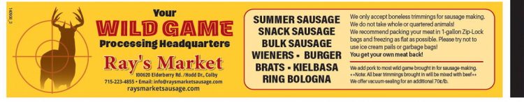 140906_3 Your WILDGAME We only accept boneless trimmings for sausage making. We do not take whole or quartered animals! We recommend packing your meat in 1-gallon Zip-Lock bags and freezing as flat as possible. Please try not to use ice cream pails or garbage bags! Processing Headquarters SUMMER SAUSAGE SNACK SAUSAGE BULK SAUSAGE WIENERS • BURGER BRATS • KIELBASA RING BOLOGNA You get your own meat back! Ray's Market 100620 Elderberry Rd. /Hodd Dr., Colby We add pork to most wild game brought in for sausage-making. **Note: All bear trimmings brought in will be mixed with beef** We offer vacuum-sealing for an additional 70¢/lb. 715-223-4855 • Email: info@raysmarketsausage.com raysmarketsausage.com 140906_3 Your WILDGAME We only accept boneless trimmings for sausage making. We do not take whole or quartered animals! We recommend packing your meat in 1-gallon Zip-Lock bags and freezing as flat as possible. Please try not to use ice cream pails or garbage bags! Processing Headquarters SUMMER SAUSAGE SNACK SAUSAGE BULK SAUSAGE WIENERS • BURGER BRATS • KIELBASA RING BOLOGNA You get your own meat back! Ray's Market 100620 Elderberry Rd. /Hodd Dr., Colby We add pork to most wild game brought in for sausage-making. **Note: All bear trimmings brought in will be mixed with beef** We offer vacuum-sealing for an additional 70¢/lb. 715-223-4855 • Email: info@raysmarketsausage.com raysmarketsausage.com